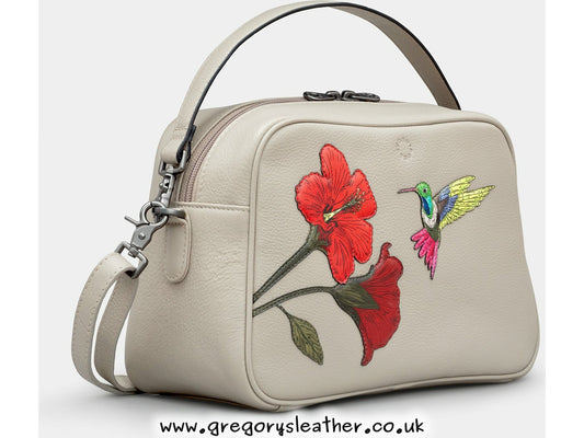 Warm Grey Petals & Feathers Hummingbird Multiway Leather Cross Body Bag by Yoshi