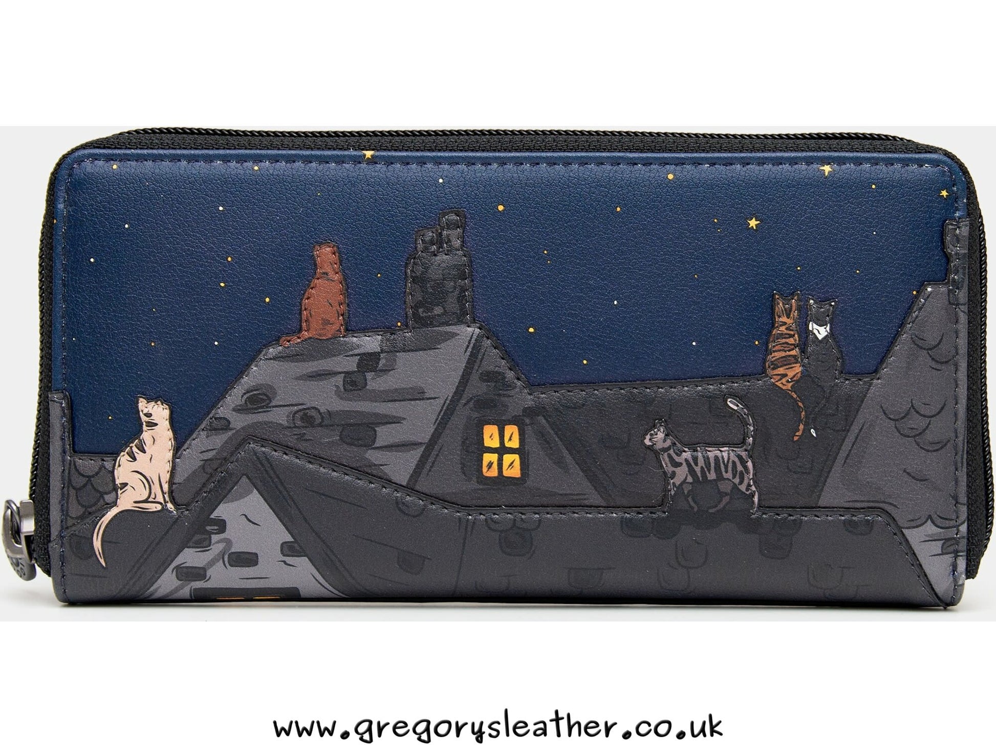 Our Stargazing Cats zip around purse with feline themed nighttime applique scene on the front.
